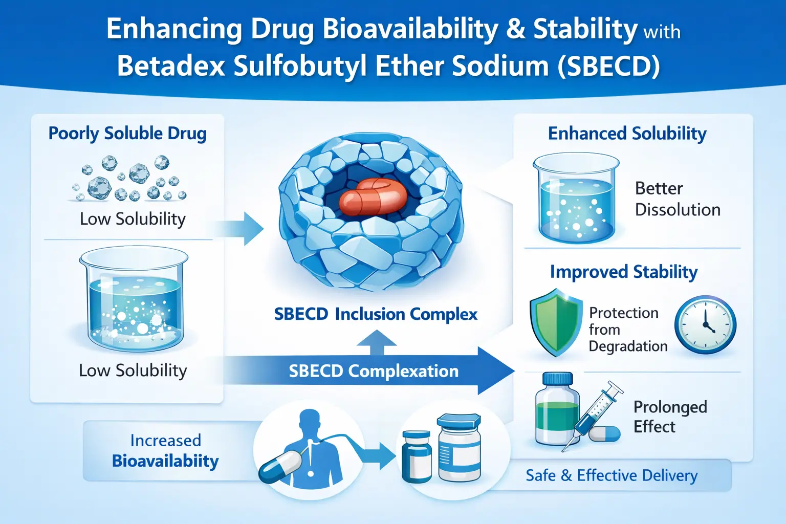 SBECD бірегей химиялық құрылымы оған бұл мәселені шешуге көмектеседі. Циклодекстрин магистральдары гидрофобты дәрілік молекулалар үшін кеңістік жасайды, ал сульфобутил эфир топтары препараттың суда еруін өте жеңілдетеді. Оның екі қасиеті бар болғандықтан, SBECD есірткіні жеткізудің тамаша тәсілі болып табылады.